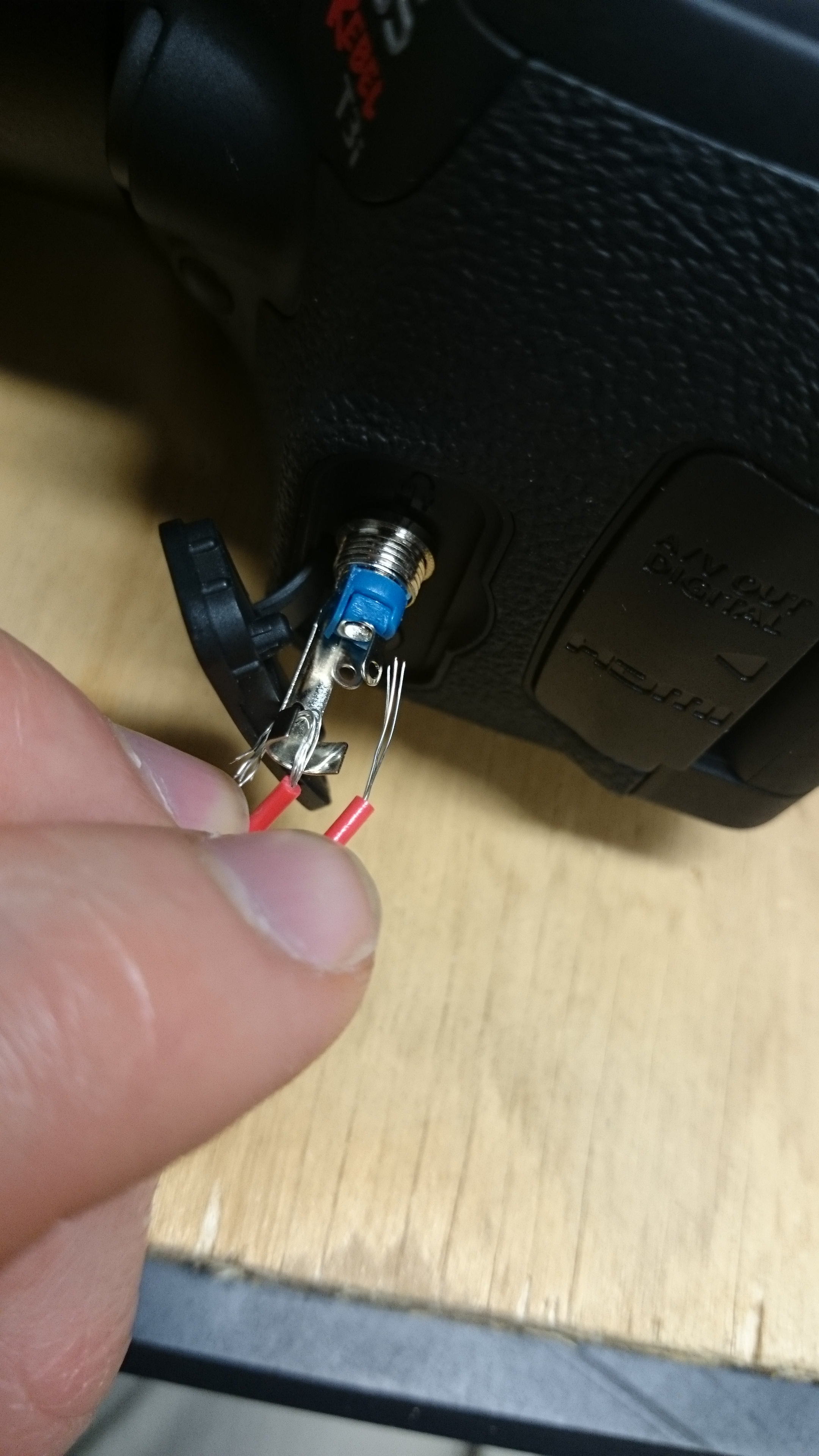 As the camera will be left to operate by itself, an automatic way of firing the shutter (taking the picture) is needed. I modified a standard 2.5mm stereo plug by shorting the outer contact (outer ring) with the inner contact (inner ring)by removing the black plastic cover and soldering the corresponding connectors together (and removing the middle connector). This plug is then inserted into the remote control port of the camera, and tells the camera that the shutter trigger is being pressed.