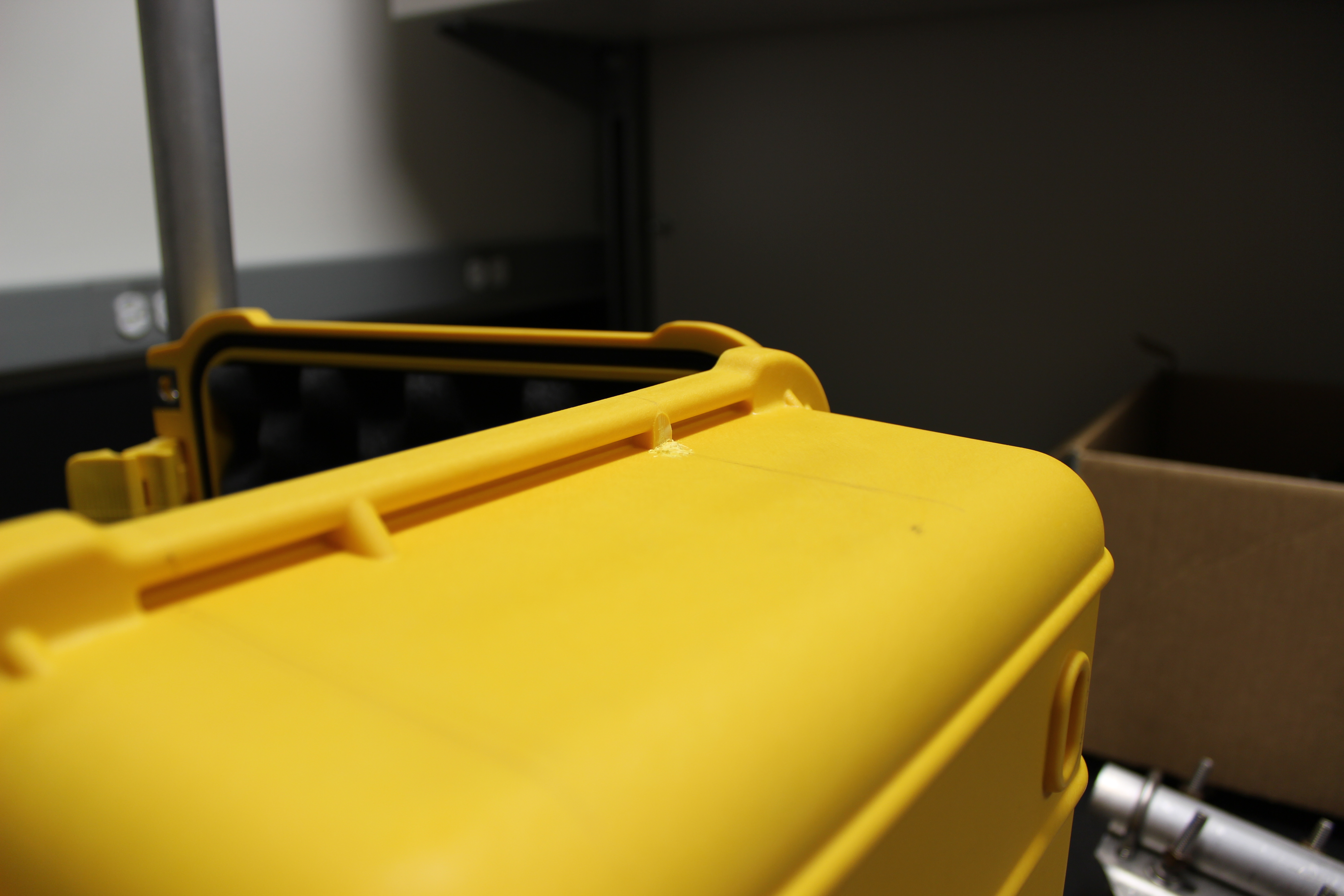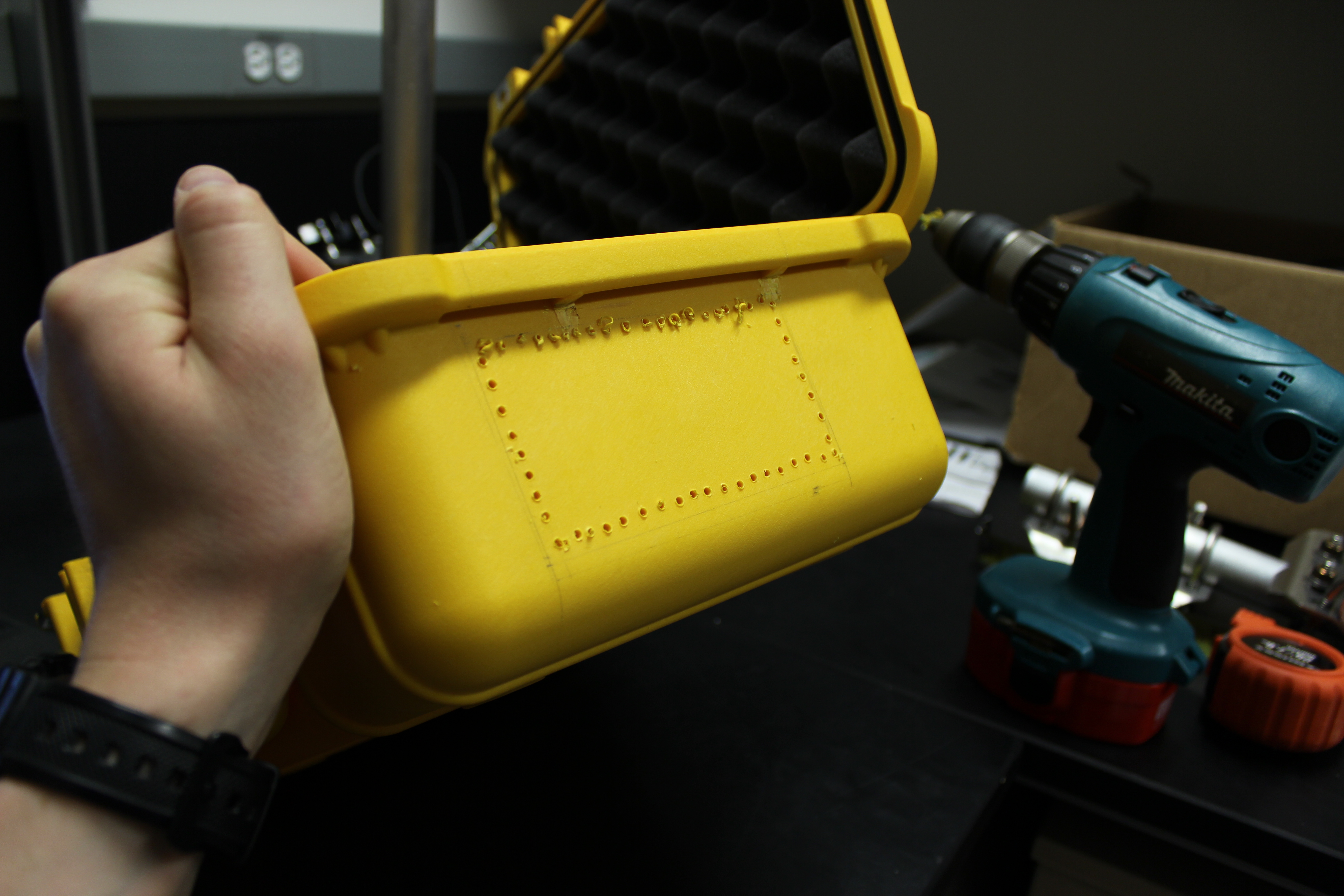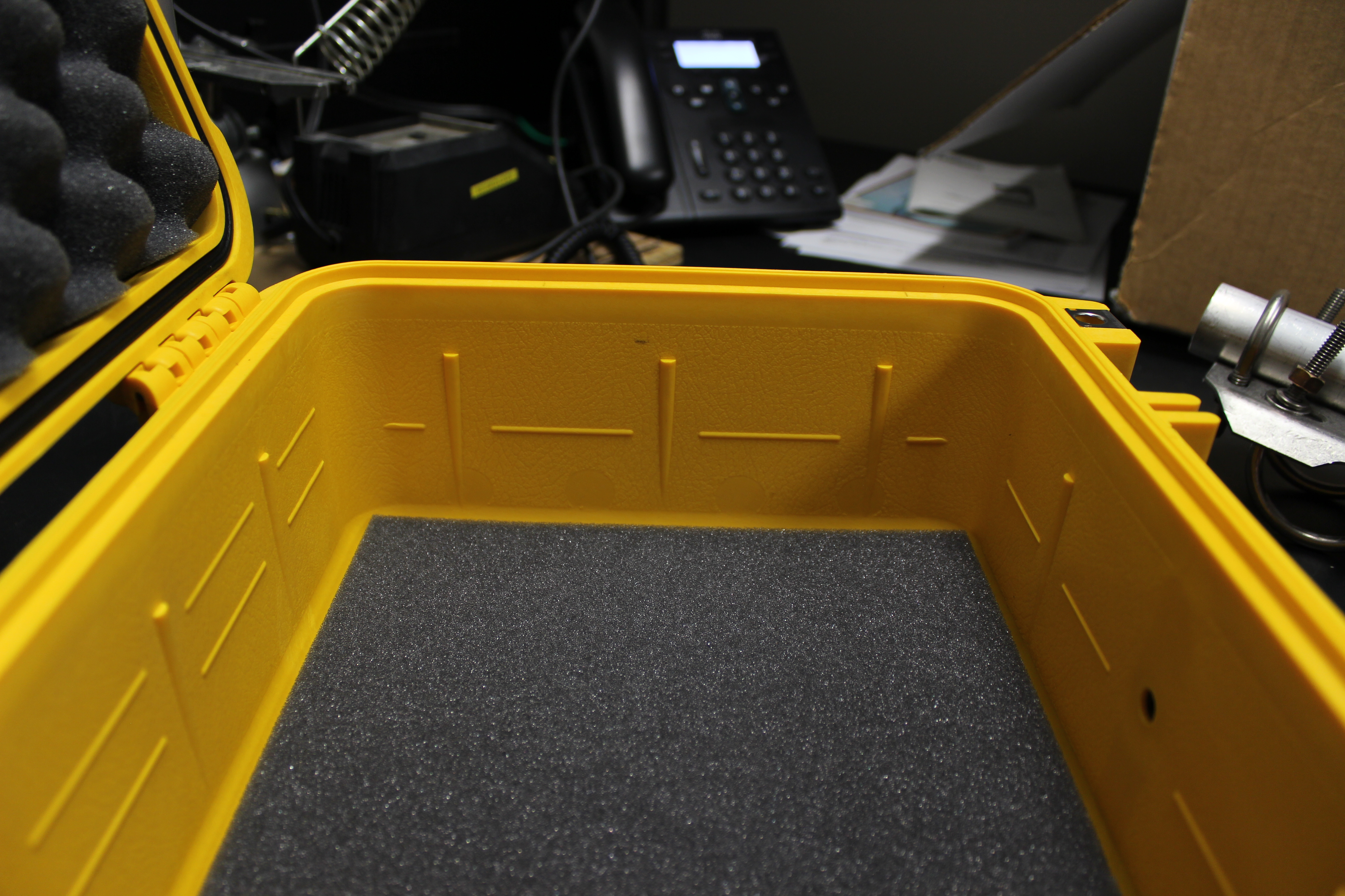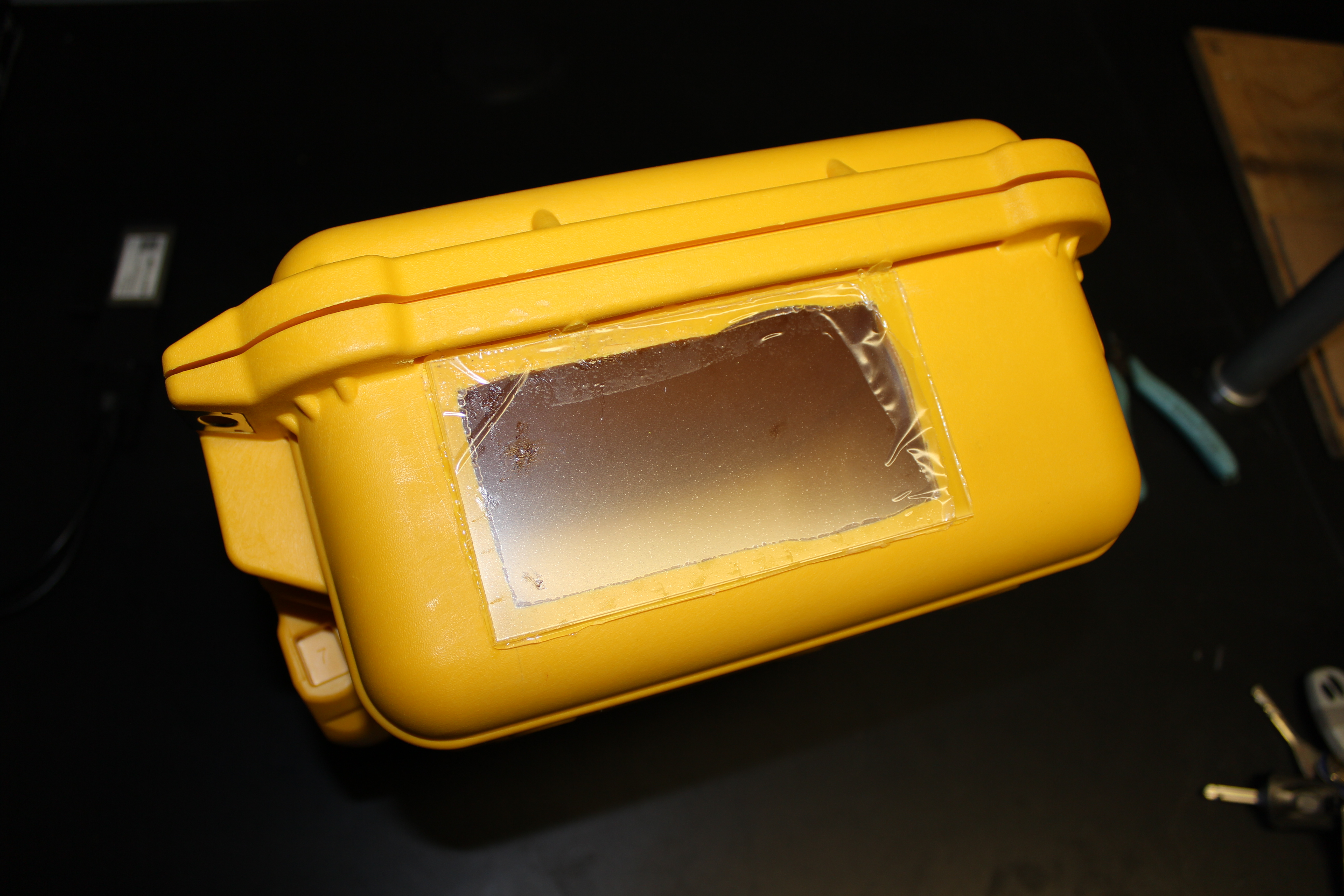 In order to weatherproof the camera rig, and keep it protected, I housed the equipment in a Pelican case. Firstly, I cut foam to fit the various components so that they are held securely in place. As a camera will not work very well in a completely opaque box, I created a window. I cut out a section of the side wall, using a drill and knife initially for the rough cut, and then a file to smooth the edges. I fitted a piece of clear acrylic for the window; I chose transparent acrylic rather than glass as it is easier to cut and is less likely to scratch or break . I bought acrylic that had a protective removable plastic covering (like cling film) which I left on until the end of building so as to avoided scratches. Basically, I treated the window like I would a lens. I used a silicone glue to attach the acrylic to the box, and left it to cure for 24 hours.