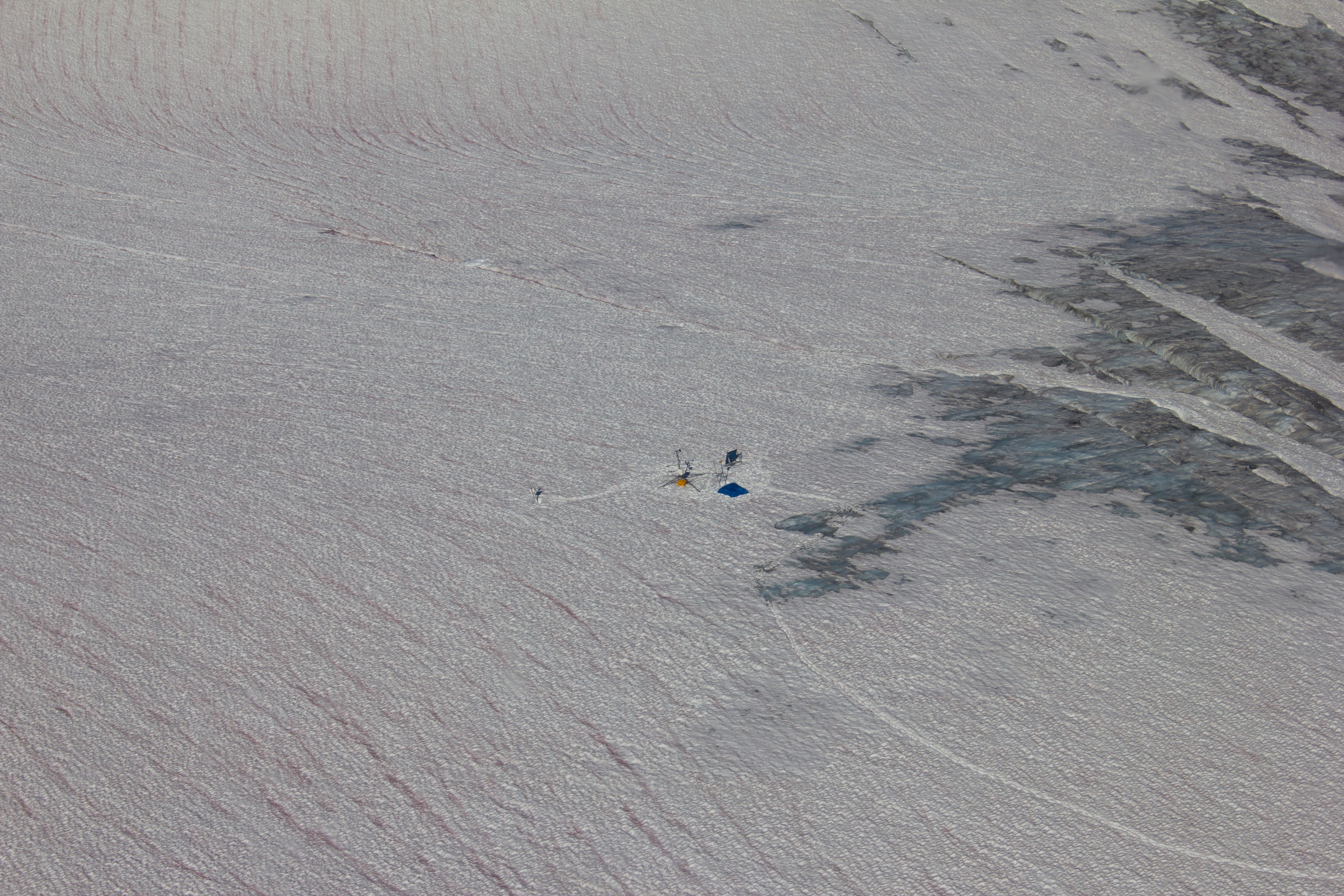 The completed station, looking northwest. The solar panel can be seen in the left background, which recharges the batteries housed in the yellow case. The rain gauge and the snow/ice level monitor mast is behind the main station. The blue tarp contains the tools and equipment used for the installation, and will be left secured on the glacier until the station is dismantled.