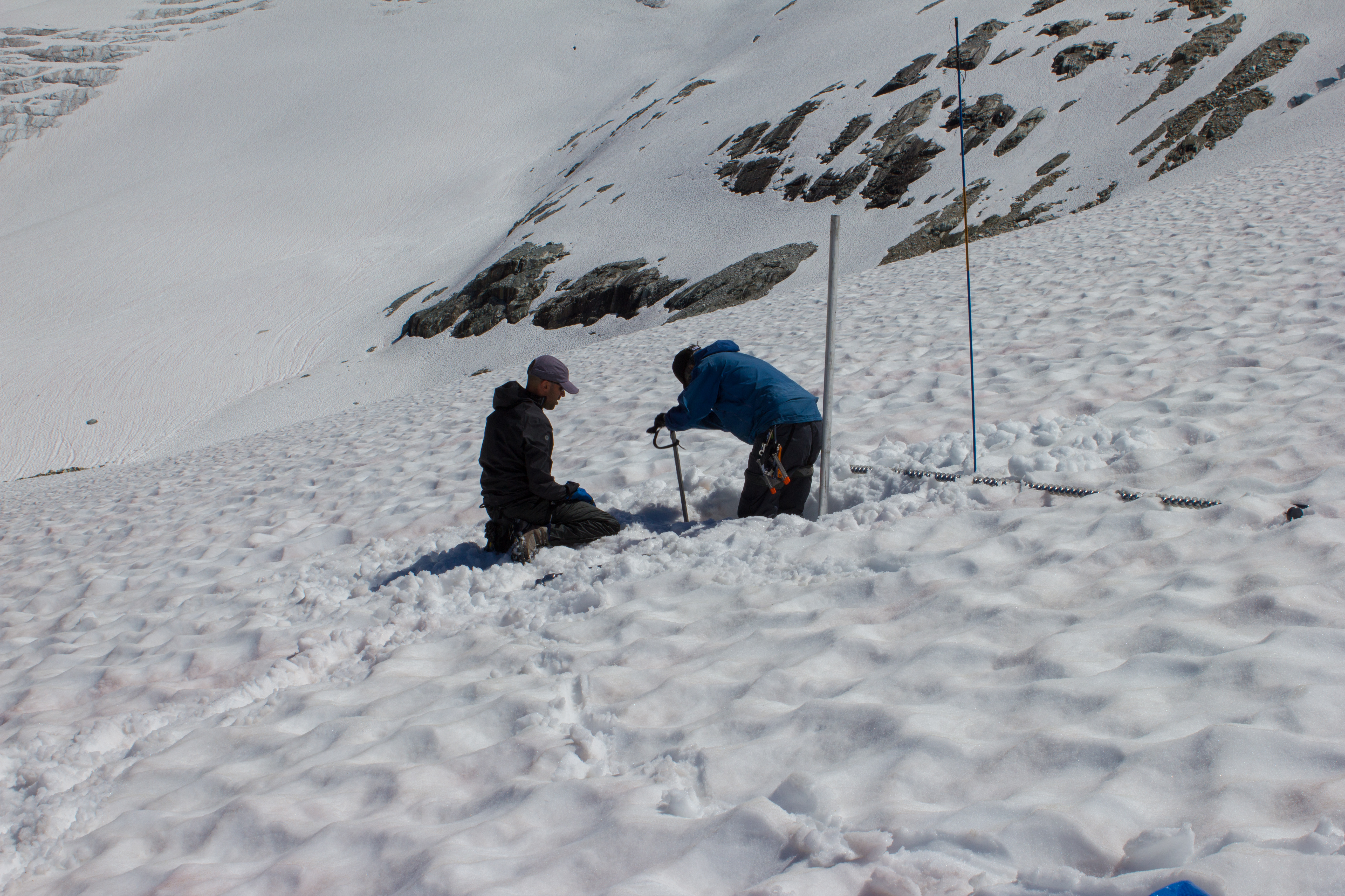 The winter snowpack was still hiding crevasses. Where it had melted, large swaths of cracked and yawning ice had been exposed, hinting at what may lie beneath the snow cover.