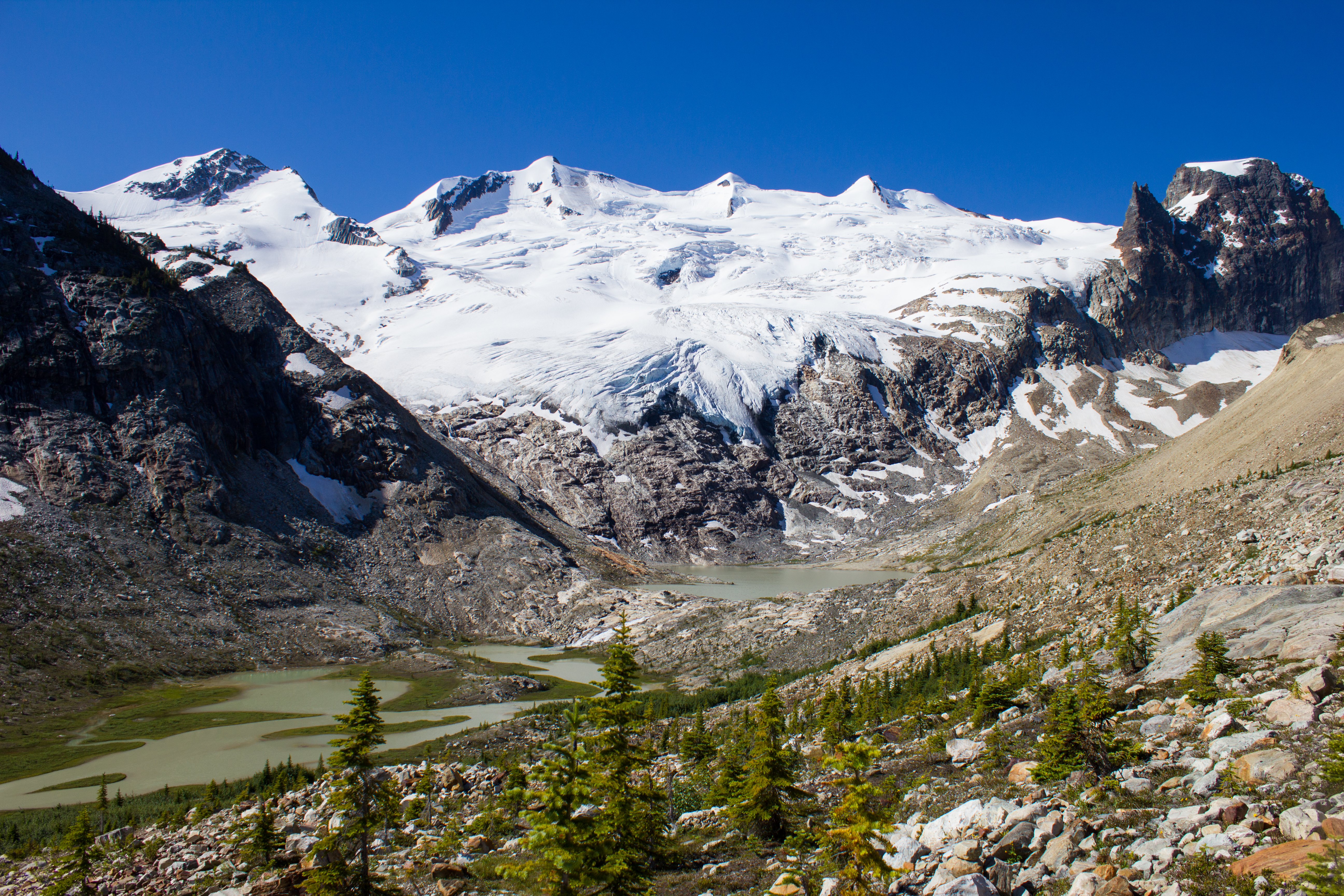 Medial moraines and incredibly blue melt water pools.