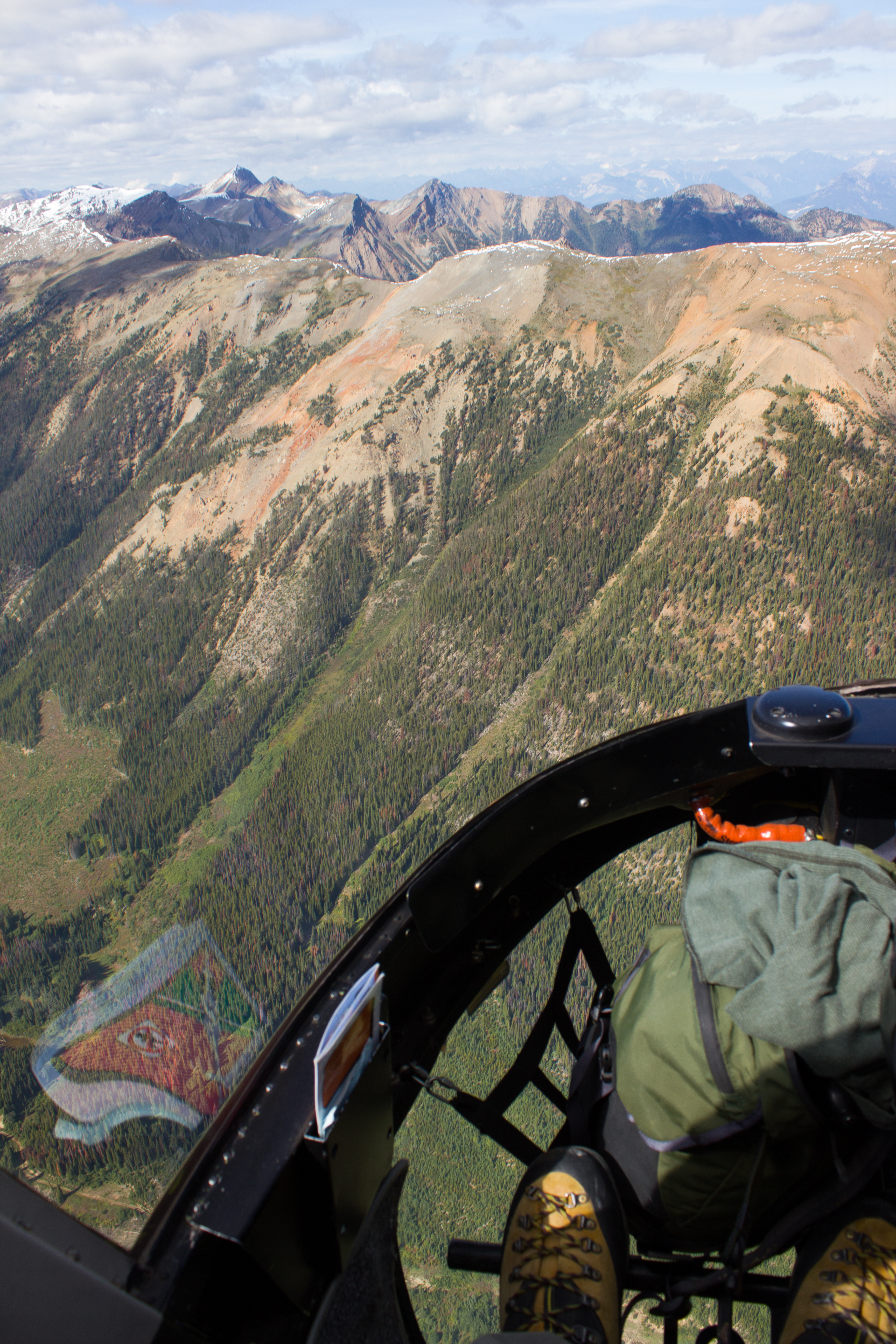 I made it into Golden after dark, with the silent flashes of distant thunderstorms hinting at what the weather would have in store for us. Once again, I was being hosted by Tannis and Steve (of Sorcerer Lodge), and was grateful for a place to sleep that night. A short drive to the helicopter early the next morning, and we were on our way back into the mountains.  We were a group of five; Rob Vogt and Ben Pelto from UNBC, Bob Sawyer, Steve, and myself.