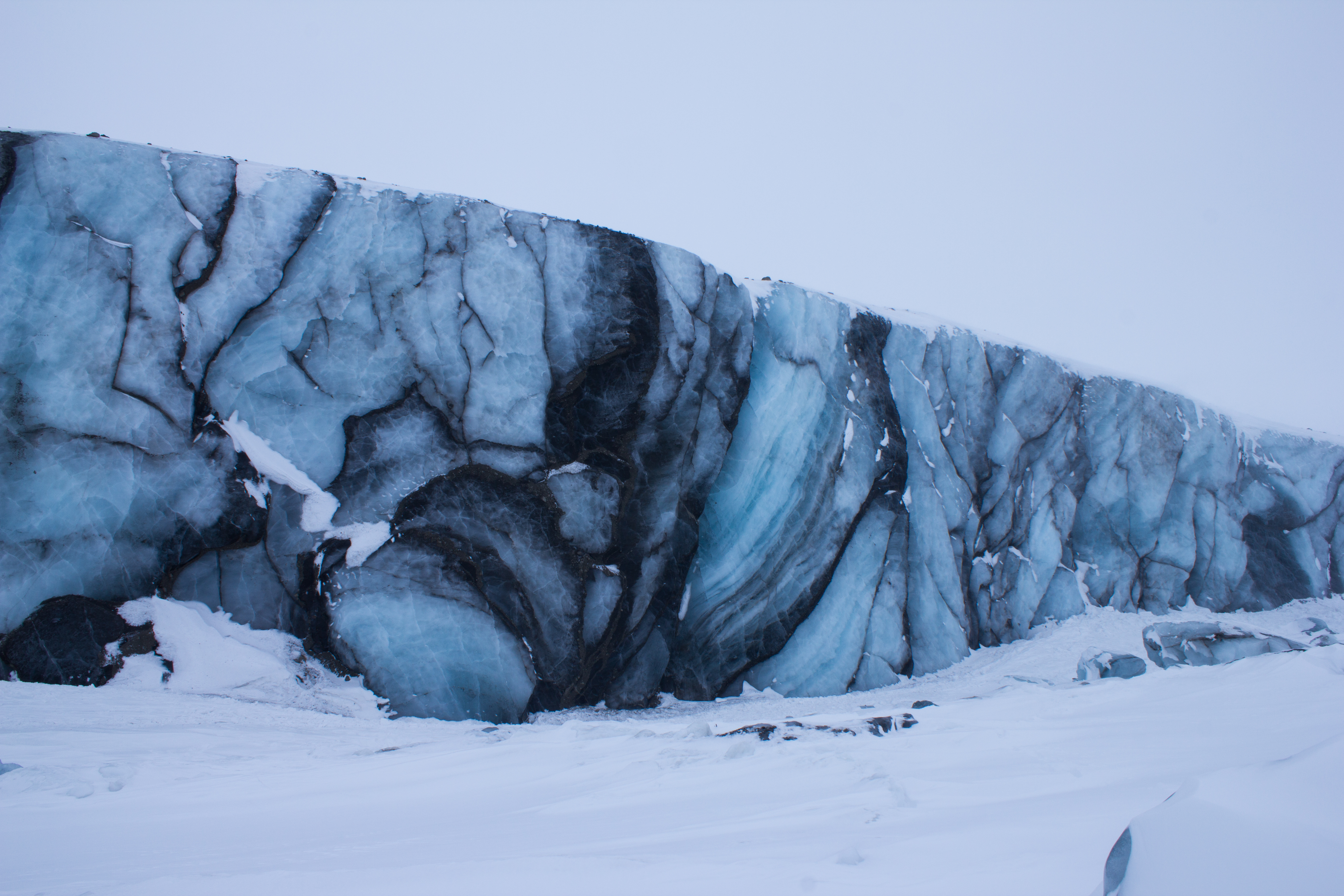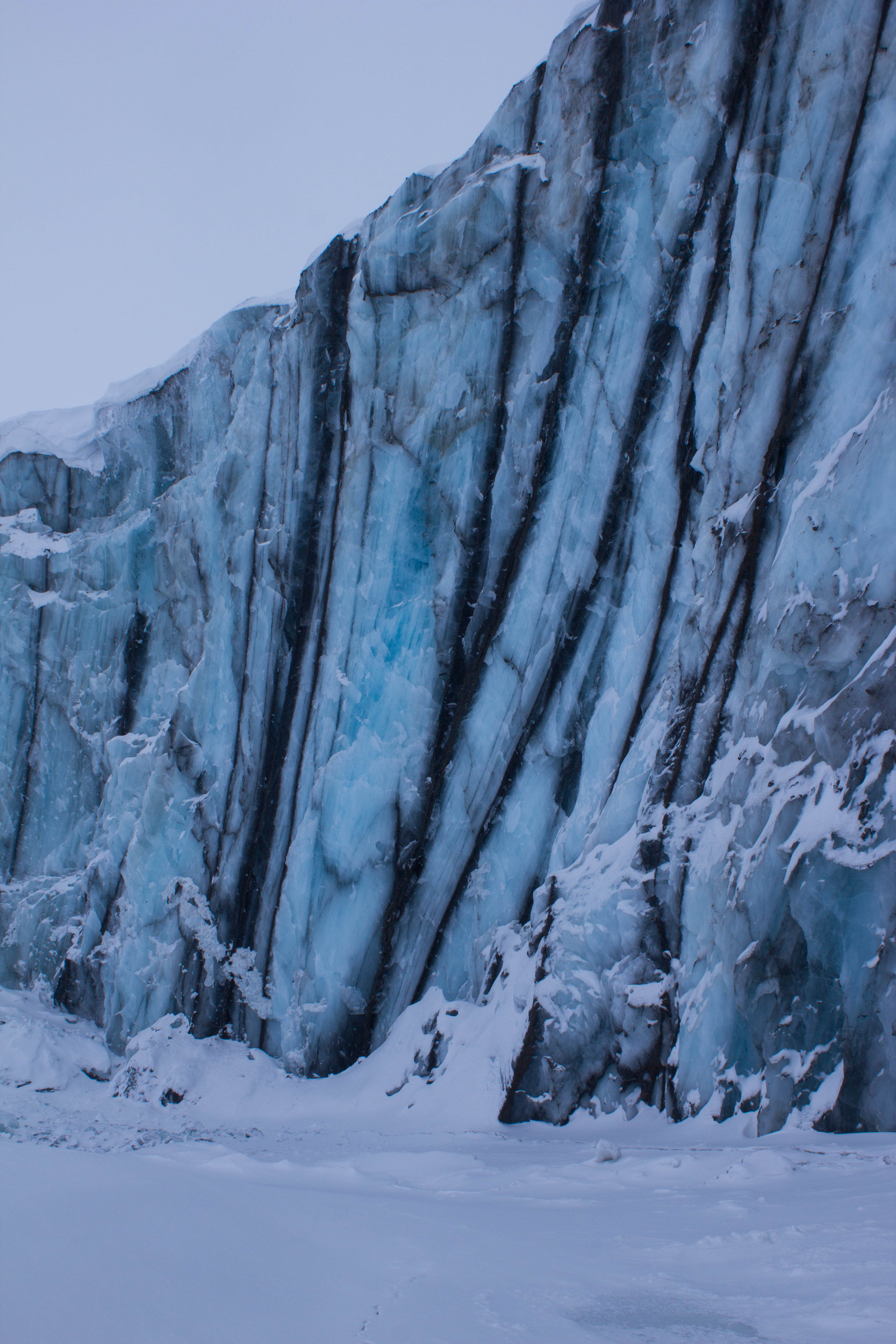 Crevasses or cracks on the glacier surface can collect dust or sediment. The dark coloured bands in this image may represent old crevasses which have closed and been buried deeper into the glacier, leaving behind a layer of dust in the ice.